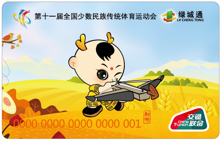 “第十一屆全國少數民族傳統體育運動會”“綠城通”射弩紀念卡屬于不記名卡,為慶祝“第十一屆全國少數民族傳統體育運動會”而限量發行的具有收藏價值的卡片,具有普通優惠卡所有功能。卡片售出后歸持卡人所有,無押金。